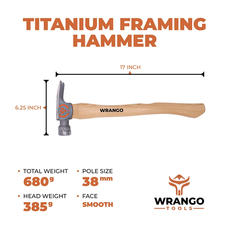 The Wrango Tools titanium framing hammer with 17in hickory handle will reduce your carry weight and save your shoulder. Titanium is 45% lighter with the same strength as steel. Titanium absorbs shock and vibration impact better than steel, saving your hand, arm, elbow, and shoulder from unnecessary fatigue. Titanium is corrosion resistant so it will never rust. Our titanium is also tougher and more flexible than steel, so it has superior resistance to breaking, cracking, and chipping under impact and stress. As a professional general contractor or framer, you can only withstand so much wear-and-tear on your body. Stop putting your body through unnecessary pain and switch to titanium now.